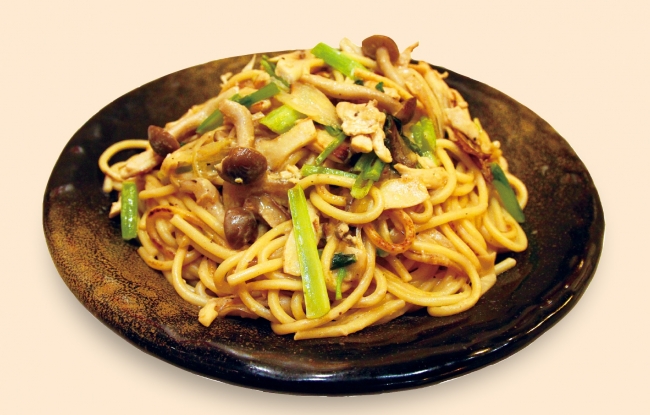 『キノコと鶏肉の豆乳仕立て』は、秋の味覚のキノコ3種(マイタケ、しめじ、エリンギ)と鶏肉をもちもち食感の極太麺と一緒に炒め、濃厚な豆乳クリームソースで仕上げた一品です。