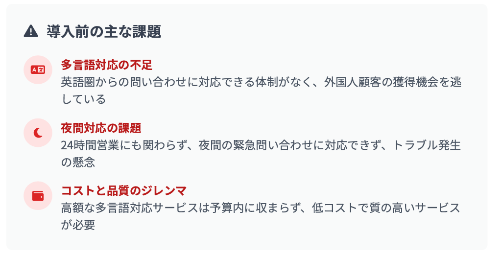 一方で、外国人ゲストからの問い合わせ対応や夜間のトラブル対応など、即時性と正確性が求められるコミュニケーションに課題がありました。