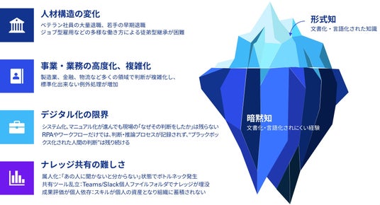 人材構造の変化や業務の高度化により、徒弟型の知識継承が困難となり、属人化や判断のブラックボックス化が進んでいます。こうした状況は業務品質や組織競争力に深刻な影響を及ぼし、事業継続性にもリスクをもたらしています。さらに、システム化が進んでも「なぜその判断をしたのか」が記録されず、知識が組織に蓄積されない状況が続いています。こうした課題は業種・業界を問わず広く存在し、事業継続性にもリスクをもたらしています。