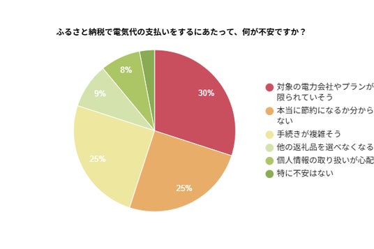 ふるさと納税で電気代を支払う際の不安点として最も多かったのは、「対象の電力会社やプランが限られていそう」(58%)で、次いで「手続きが複雑そう」(49%)、「本当に節約になるか分からない」(48%)といった声が目立ちました。