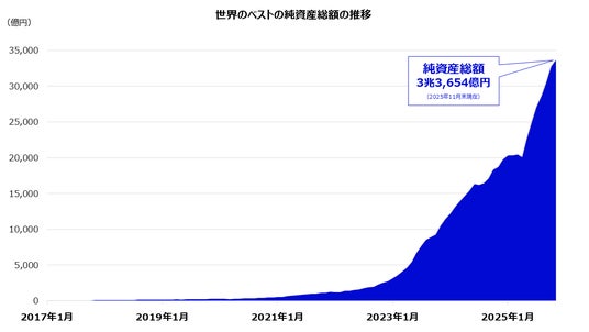 2017年以降、2025年11月末で8年超(107カ月)連続で資金純流入を記録し、2025年11月末の運用資産額は6ファンド合わせて3兆3,654億円