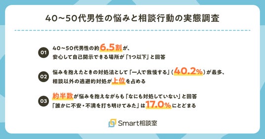 株式会社Smart相談室(本社:東京都港区、代表取締役・CEO:藤田 康男、以下:「当社」)は、40~50代の社会人男性415名を対象に、40~50代男性の悩みと相談行動の実態調査を実施しましたので、お知らせいたします。