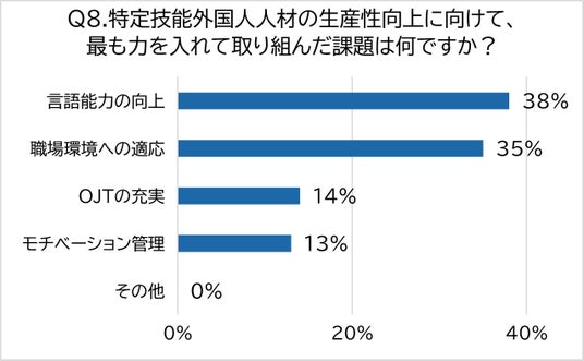 特定技能外国人材の生産性向上に向けて取り組んだ課題として、最も回答を集めたのは「言語能力の向上」(38%)です。既存の日本人従業員などと適切なコミュニケーションを図るためにも、特定技能外国人の日本語能力を伸ばすことは重要といえます。