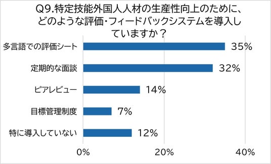 生産性向上のために導入している評価・フィードバックシステムとして、最も回答が多かったのは「多言語での評価シート」(35%)でした。豊富な言語に対応した評価シートを活用することで、外国人人材の仕事に関する評価を正確に伝えられます。