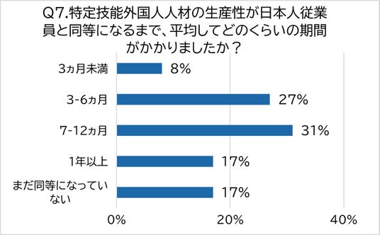 なお、日本人従業員と生産性が同等になった期間として、「1年以上」と「まだ同等になっていない」という回答は同率の17%です。日本人従業員と同様に、中長期的な視点で育成・指導を行うことも大切です。
