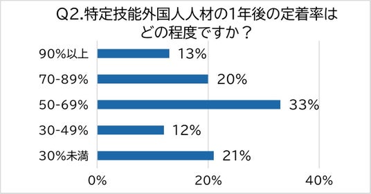 特定技能外国人材の1年後の定着率に関するアンケートでは、「50-69%」が約3割と最も多い結果となりました。また、定着率が「90%以上」という回答が約1割、「70-89%」が約2割と、受入れ先によっては非常に高い定着率を達成しています。一方、定着率が「30-49%」とする回答は約1割、「30%未満」とする回答は約2割となっており、総合的に見て、特定技能外国人材の定着率は高めであることがうかがえます。