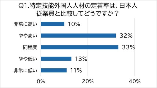 特定技能外国人材の定着率を日本人従業員と比較したアンケートでは、「やや高い」(32%)と「非常に高い」(10%)というポジティブな回答が約4割を占めています。