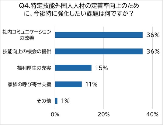 次に回答を集めたのは「福利厚生の充実」(15%)で、そのあとは「家族の呼び寄せ支援」(11%)と続きました。外国人ならではの悩みなどを解消するための、法定福利厚生を設けることも検討してみるとよいでしょう。