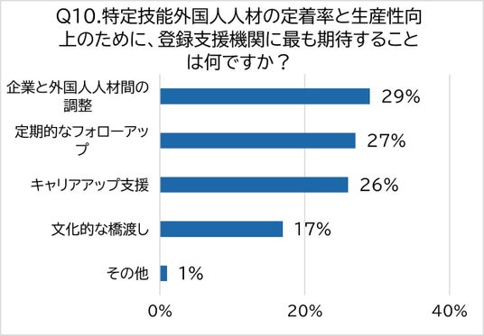 次に回答を集めたのは「定期的なフォローアップ」(27%)で、そのあとは「キャリアアップ支援」(26%)、「文化的な橋渡し」(17%)と続きます。登録支援機関によっては、外国人向けのポータルサイトやコールセンターで生活支援をしているため、定期的なフォローアップを実施してくれます。