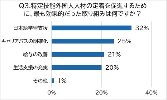 次いで回答が多かったのは「キャリアパスの明確化」(25%)で、「給与の改善」(21%)、「生活支援の充実」(20%)と続いています。これらの結果から、特定技能外国人材が安心して日本で働けるよう、職場・生活環境の整備に重点を置いて取り組んだことがうかがえます。
