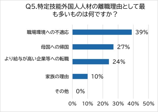 特定技能外国人材の離職理由として最も多かったのは、「職場環境への不適応」(39%)です。外国人材が働きやすい職場環境を構築するために、やさしい日本語を日本人従業員が使う などの対策を怠らないようにしましょう。