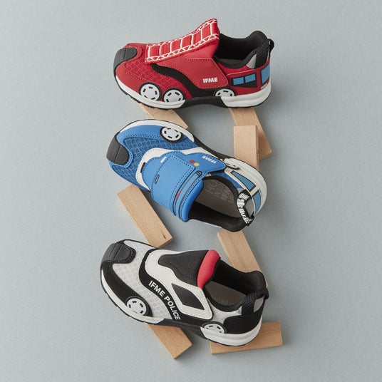 IFMEから様々なのりものをテーマにした「IFME のりものシリーズ」が登場します。子どもたちに馴染のあるのりものをシューズデザインに落とし込み、車好きな子どもたちに向けた商品を展開します。