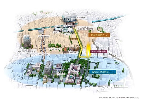 ・駅前で市街地再開発事業が進行するJR「浦和」駅西口から徒歩8分。東京、品川、池袋、新宿など都心の主要駅への直通アクセスが可能