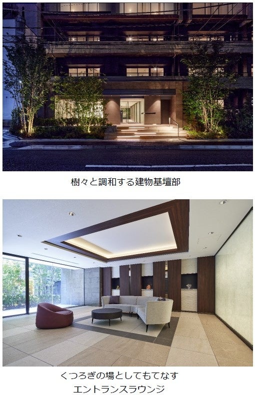 建物外観は、ダブルマリオンや上層階へ上がるほど透明度が高いガラス手すりを採用し、外観全体が空に向けて伸びてゆくような印象を創出しています。エントランスラウンジは、柔らかな光を放つ「光壁」と窓面から見える緑の潤いにより、上質な空間づくりをしています。