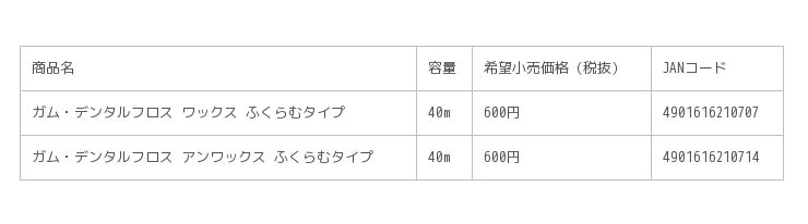 また、「ガム・デンタルフロス ワックス ふくらむタイプ」「ガム・デンタルフロス アンワックス ふくらむタイプ」については、新たなデザインで改良発売します。