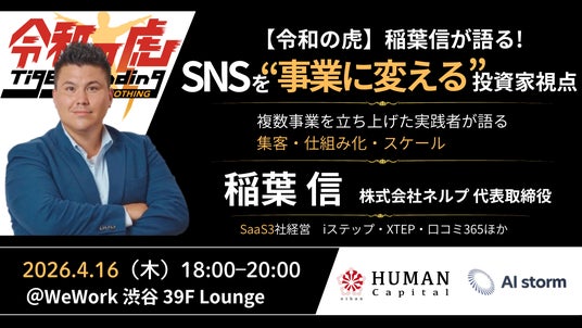 AIストーム株式会社(旧株式会社ジェクシード、本社:東京都千代田区、代表取締役社長 今井俊夫、証券コード:3719)は、2026年4月16日(木)18:00より、WeWork 渋谷スクランブルスクエア 39Fラウンジにて「AIストーム特別セミナー "令和の虎"が語る SNSを"事業に変える"投資家視点とは!」を開催いたします。