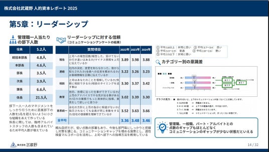 同社の強さの根幹である、現場と経営をつなぐリーダー層の育成についても重点的に記述されています。「幹部塾」などの体系的なプログラムに加え、1on1やコミュニケーションアンケートを通じた「信頼関係の数値化」など、リーダーシップが精神論ではなく、科学的なアプローチで醸成されているプロセスが明示されています。
