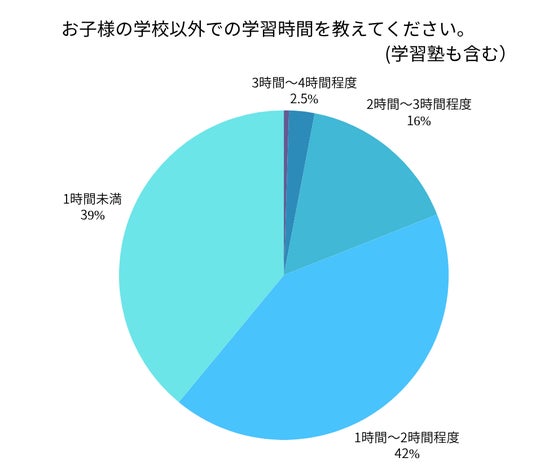 最も多かったのは「1時間~2時間程度」で42%、次いで「1時間未満」が39%となりました。全体の約8割がこの2つの選択肢に集中しており、多くのご家庭では、1日あたりの学習時間を比較的短く設定していることがうかがえます。