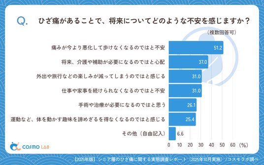 「痛みが今より悪化して歩けなくなるのではと不安」(51.2%)が最多で、「将来、介護や補助が必要になるのではと心配」(37.0%)が続きました。
