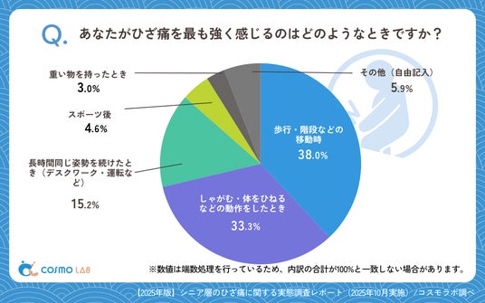 最多は「歩行・階段などの移動時」(38.0%)で、「しゃがむ・体をひねるなどの動作をしたとき」(33.3%)が続きました。