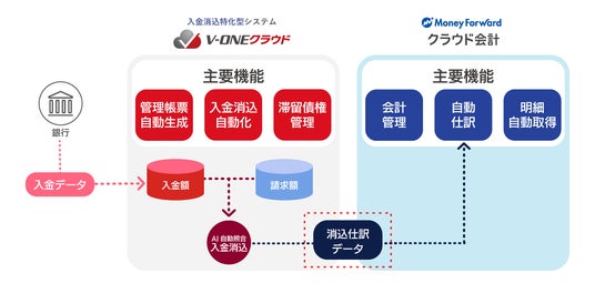 株式会社アール・アンド・エー・シー(東京都中央区、代表取締役社長 太刀川秀臣、以下R&AC)が提供する入金消込特化型システム「V-ONEクラウド」は、株式会社マネーフォワード(東京都港区、代表取締役社長CEO 辻庸介、以下マネーフォワード)が販売するクラウド会計ソフト「マネーフォワード クラウド会計」に消込仕訳を連携できるAPI機能をリリースしました。