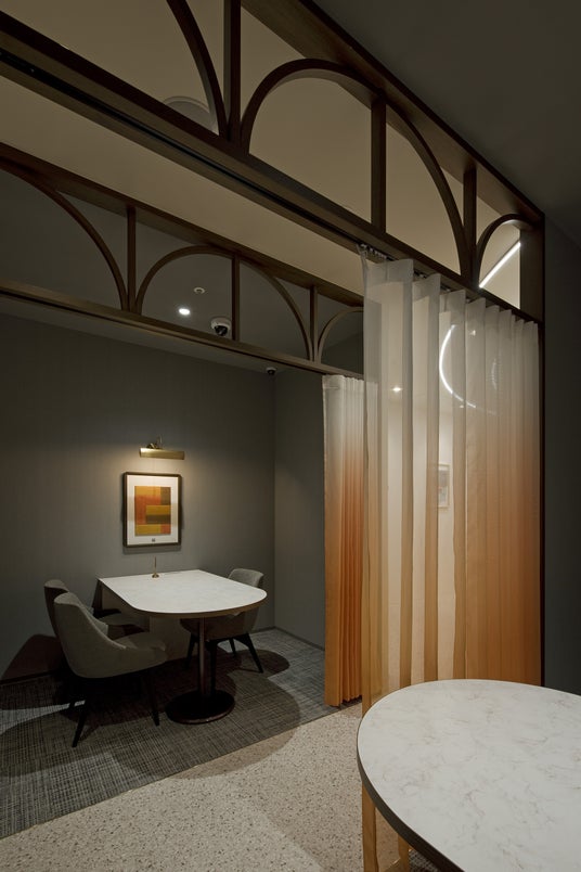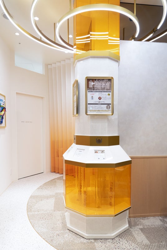 “ときめき”をめぐらせるブランド価値を店舗で体験していただくため、従来の買取店舗とは一線を画す、コミュニケーションラウンジを設けた、上質で洗練された空間を創出しました。環境にやさしいリサイクル素材を採用したタイルカーペットやアップサイクル素材を活用した店内アートを取り入れ、空間デザインにも循環型社会への意識を反映。人とモノの物語や想いが紡がれていく循環の輪を、水面に拡がるやわらかな波紋のデザインで表現しています。さらに、お客様がサステナブルな製品や社会貢献プロジェクトを知り、買取成立後に応援したいプロジェクトに投票できる仕掛けを設計。楽しみながらモノを手放すことを選択でき、モノや想いの循環に参加している実感を得ることができる場を創出しました。