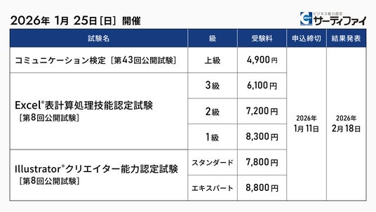 株式会社サーティファイ(本社:東京都中央区、代表取締役:瀧澤茂、以下「サーティファイ」)は、2026年1月25日(日)に開催する「コミュニケーション検定(上級)」「Excel(R)表計算処理技能認定試験」「Illustrator(R)クリエイター能力認定試験」の公開試験の申込受付を2025年11月11日より開始しました。