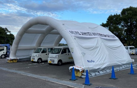 太陽工業では、2025年4月に開幕した大阪・関西万博で20ヶ所以上のパビリオン設営に協力し、大型膜面構造物を施工しています。今回の実験で使用したエアーテント「マク・クイックシェルター」は、東日本大震災や令和6年能登半島地震など、災害時の医療用途などを含めて2700張り以上の活用実績があります。今後「マク・クイックシェルター」の大型化などのニーズを分析して、自走式ファスナーの本格的な活用を提案していく計画です。また、太陽工業が展開している大型エアシェルター「BIG MQ」(ビッグエムキュー、右写真)での活用や、将来的には宇宙空間での活用なども視野に入れて開発協力を続ける予定です。