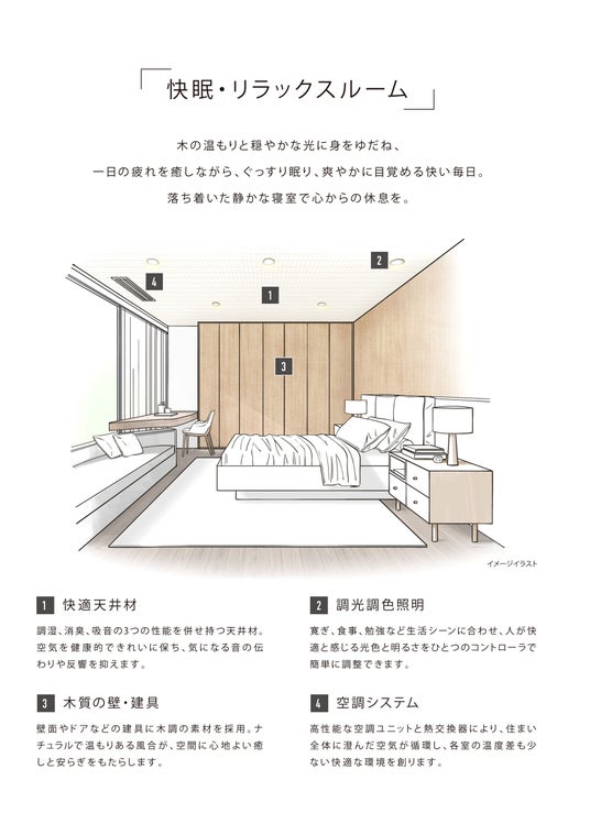 例えば、既に「CREVIA」で採用している快適天井材と調光調色照明や木質の壁・建具を組み合わせた「快眠・リラックスルーム」をはじめ、吸音天井材と遮音壁や防音ドアを組み合わせた「趣味・ライブラリー空間」などを提案していきたいと考えています。