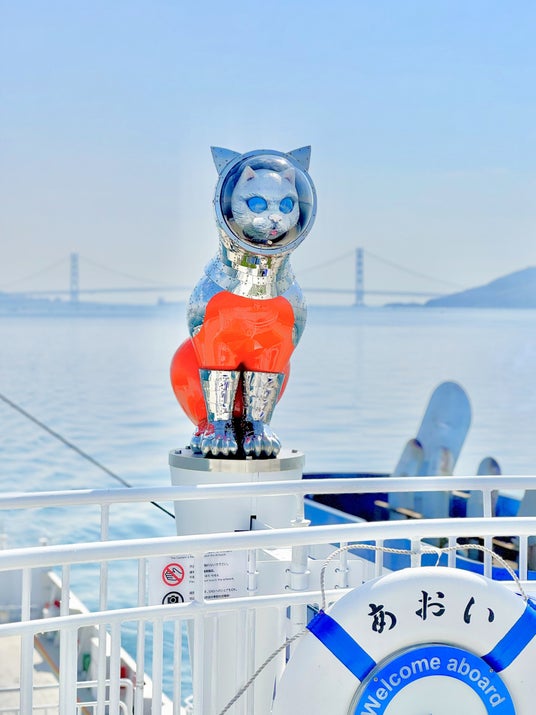 世界中に展示されているSHIP'S CATシリーズの作品の中でも、2025年4月にお披露目式が行われた『SHIP'S CAT(Boarding)』は、実際の航海中のフェリー船上に初めて展示されている貴重な作品となっています。