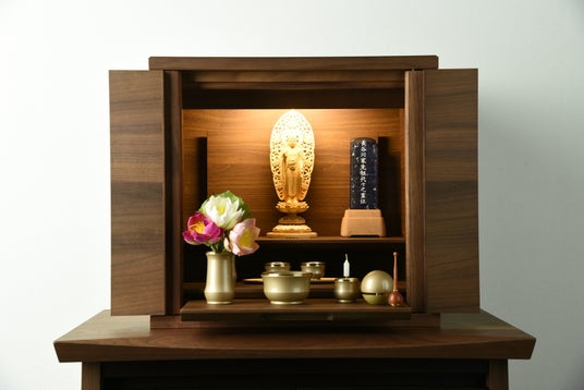 明るいトーンのお仏壇では自然で落ち着いた表情を、暗いトーンのお仏壇では深く厳かな表情を見せてくれます。