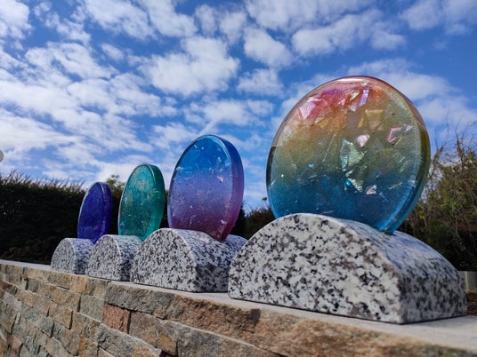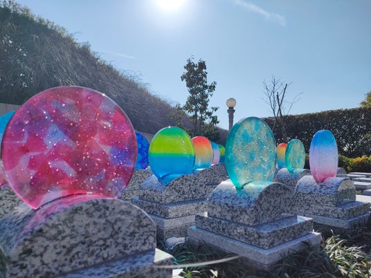 「光り墓」とは、株式会社フクイシ(本社:福島、代表取締役社長:佐藤 真也)が販売するガラス製の墓石です。「数十年後の霊園は光で満ちている」という信念から生まれた「光り墓」は、アートガラスでご遺族の心を照らす新しい墓石となっており、千葉県にあります釈迦寺霊園の樹木葬等で使用されています。従来の墓石のイメージを超えた故人様らしさを尊ぶ「最後のプレゼント」として選ばれています。