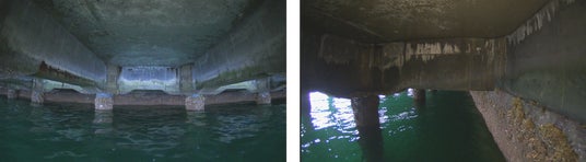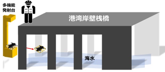 従来の点検方法では、潮流が速い場所の海上に設置されている桟橋において、潮流の影響が比較的少ない干潮時間帯で点検を行う必要があり、さらに海水面と桟橋上部工下面部との間が狭いため、小型ボートや潜水士による目視、水中ドローン等による点検の作業時間を十分に確保することが困難とされていました。今回の取り組みでは、従来の課題を解決すべく、持続可能な形での点検手法を確立するために、温風ヒーター・無線送受信装置など桟橋環境に必要な機能を加えた多機能発射台を開発し、そこから狭小空間に適した「IBIS2」を離陸させることで、制約が多い桟橋環境での調査を実現させました。
