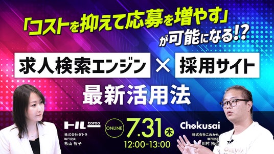 採用マーケティングATS「トルー」を運営する株式会社ダトラ(本社:大阪市中央区、代表取締役:草深悠介)は、株式会社これからとの共催で、2025年7月31日(木)、【「コストを抑えて応募を増やす」が可能になる!?求人検索エンジン×採用サイト 最新活用法】をテーマに、無料オンラインセミナーを開催いたします。