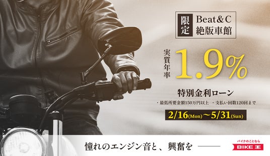 「常識を壊し、新たな価値と感動を生む」を企業理念に掲げ、「バイクライフの生涯パートナー」を目指す株式会社バイク王&カンパニー(代表取締役CEO:澤 篤史、本社:東京都世田谷区、証券コード:3377、以下「当社」)は、5月31日(日)までの期間、Beat&Cおよび絶版車館で対象のバイクをご購入の方に、実質年率1.9%の低金利ローンをご提供いたします。