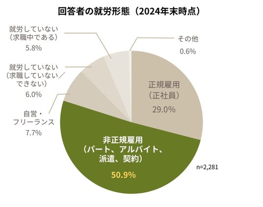 就労形態については、回答者の半数が非正規雇用で就労している(2024年末時点)ことがわかりました。