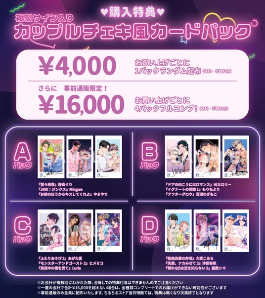 今回の通販では、特典として、4,000円お買い上げごとに複製サイン入りのカップルチェキ風カードパック(1パック3枚入り、全4種)をおつけいたします。人気BL作家が一同に揃う特典は極めてレア!このチャンスをお見逃しなく!