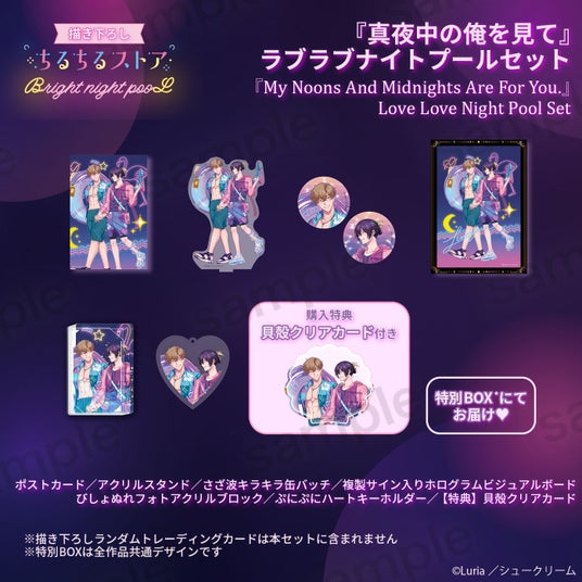 各作品のアイテム6点がセットになったまとめ買いが便利なセットです。本セットをご購入の方限定で特典として貝殻クリアカードをおつけします!さらに、ラブラブナイトプールセット専用の特別BOXにてお届け(ハート)