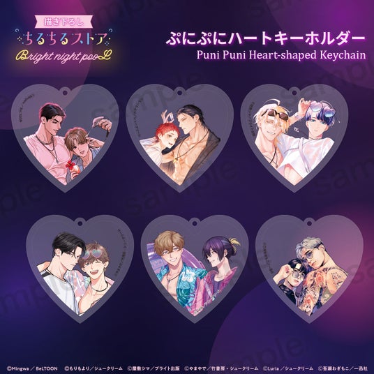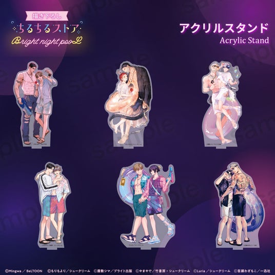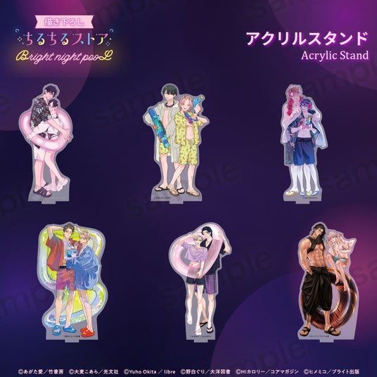 記念グッズは「ナイトプール」をテーマに、全作描き下ろしでご用意。アクリルスタンドや缶バッジなどの定番商品をはじめ、ナイトプールならではのスペシャルなグッズも…?豊富なラインナップをぜひ最後までご覧ください。