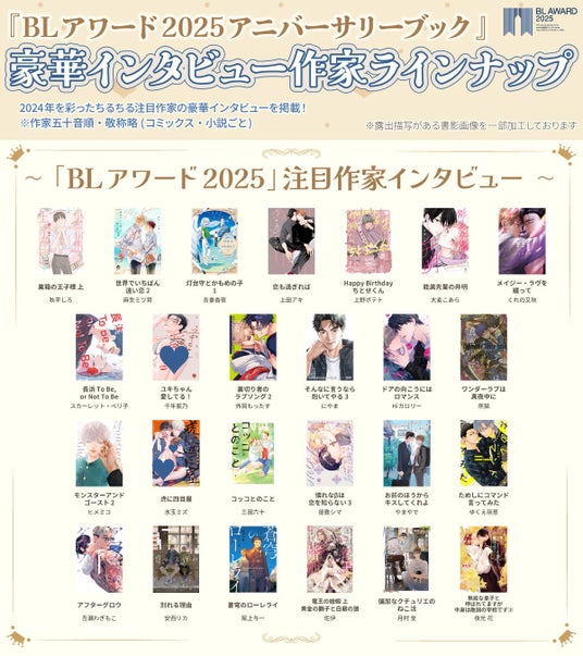 アニバーサリーブックは、BLアワード2025のノミネート作品の中から、2024年を彩ったちるちる注目作家のみなさまにインタビューを敢行。作品や制作の裏話など、ここでしか読めない貴重な内容が詰まった一冊となっております。