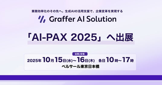 生成AI活用による企業変革を実現する株式会社グラファー(本社:東京都渋谷区、代表取締役:石井大地、以下「当社」)は、2025年10月15日(水)~16日(木)にベルサール東京日本橋で開催される「AI-PAX 2025 [第1回AIの実践的な活用展]」に出展します。当社ブースでは、利用率60%以上の汎用型生成AIサービス「Graffer AI Studio」や新サービス「業務特化AIエージェント」のデモンストレーションを実施しており、生成AIによる成果創出に向けた相談が可能です。