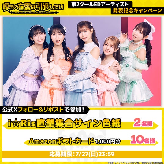 シリーズ累計発行部数200万部の大人気小説『嘆きの亡霊は引退したい ~最弱ハンターによる最強パーティ育成術~』(著:槻影/イラスト:チーコ)の第2クールEDテーマアーティストはi☆Risに決定しました。さらに、発表を記念して、i☆Risのサイン色紙が当たるキャンペーンを開催中です。