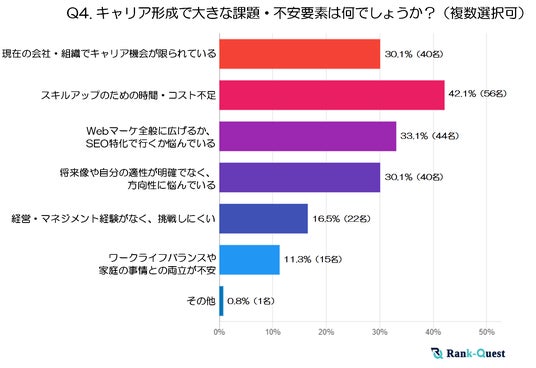 最も多かった回答は「スキルアップのための時間・コスト不足」で、42.1%(56名)に上りました。次いで「Webマーケ全般に広げるか、SEO特化で行くか悩んでいる」が33.1%(44名)、「現在の会社・組織でキャリア機会が限られている」と「将来像や自分の適性が明確でなく、方向性に悩んでいる」が同率の30.1%(40名)となっています。