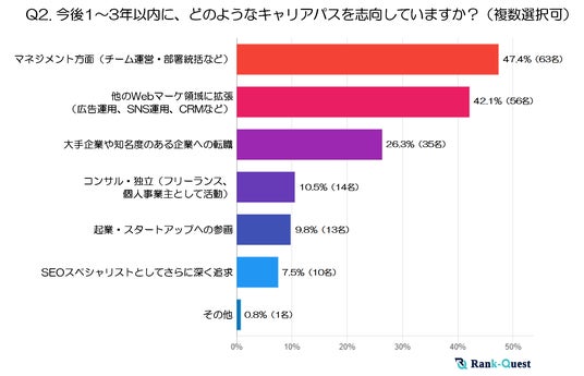 最も多かった回答は「マネジメント方面(チーム運営・部署統括など)」で47.4%(63名)でした。次いで「他のWebマーケ領域に拡張(広告運用、SNS運用、CRMなど)」が42.1%(56名)、「大手企業や知名度のある企業への転職」が26.3%(35名)と続きます。