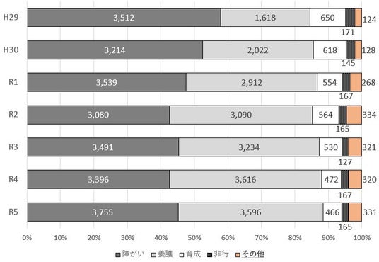 市では少子化が進んでいる一方で、学校の現場では、子どもたち一人ひとりが抱える課題が多様化しています。不登校や行き渋り、発達障がい、学びや日常生活のつまずき…。岐阜県の児童の相談内容をみても、障がいや養護、育成には当てはまらない「その他」の相談件数が増加傾向にあります。