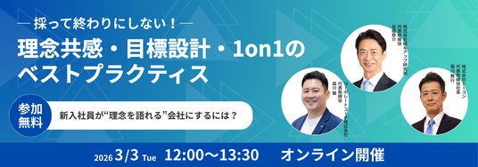 株式会社給与アップ研究所(本社:東京都千代田区、代表取締役:高橋 恭介)は、コーポレートコーチ株式会社(代表取締役:森川 駿)、株式会社トーコン(代表取締役社長:堀川 教行)とともに、無料オンラインセミナー「採って終わりにしない!理念共感・目標設計・1on1のベストプラクティス」を2026年3月3日(火)に開催いたします。