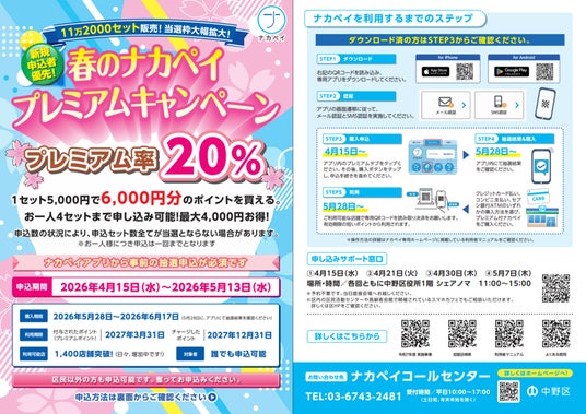 この度、中野区は「春のプレミアム付ナカペイ」について、2026年4月15日(水)より、申込受付を「ナカペイ」アプリ上で開始しましたので、お知らせいたします。本事業では、当社がシステムおよびアプリの提供を担い、運営事務局は株式会社JTB(東京都品川区、代表取締役社長執行役員:山北栄二郎)が担当しております。