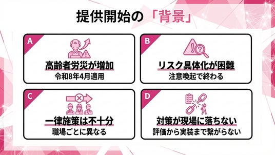 一方で、現場の労災予防は「どこが危ないか」「何をすれば減るか」を具体化できず、結果として全社一律の施策や精神論の注意喚起に寄りやすい課題があります。