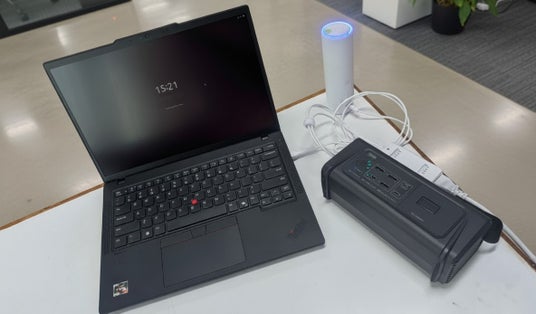 設備全体 左:エッジサーバ(SIMスロット付属ノートブックPC)、上:アクセスポイント、右:モバイルバッテリー