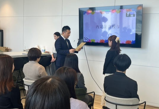 内定者からは、「内定式当日は、内定者がリクルートスーツで集まって代表者がスピーチをし、社員の方と関わることもないまま終わるイメージだったが、式の後もランチやイベントで同期や社員の方と関わって交流を深めることができた。入社後も会社の一員と貢献できるように頑張りたいと思った。」といった声が聞かれました。